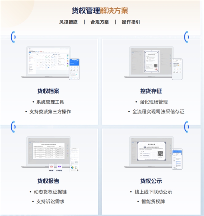 在货权管理平台中嵌入存证功能,可实时记录货权转移、交付确认、占有变更等关键节点,通过“时空定位+业务流程+多方确认”的多维存证模式,形成完整、不可篡改的权属流转证据链,方便各方实时核验货权真实性与状态。